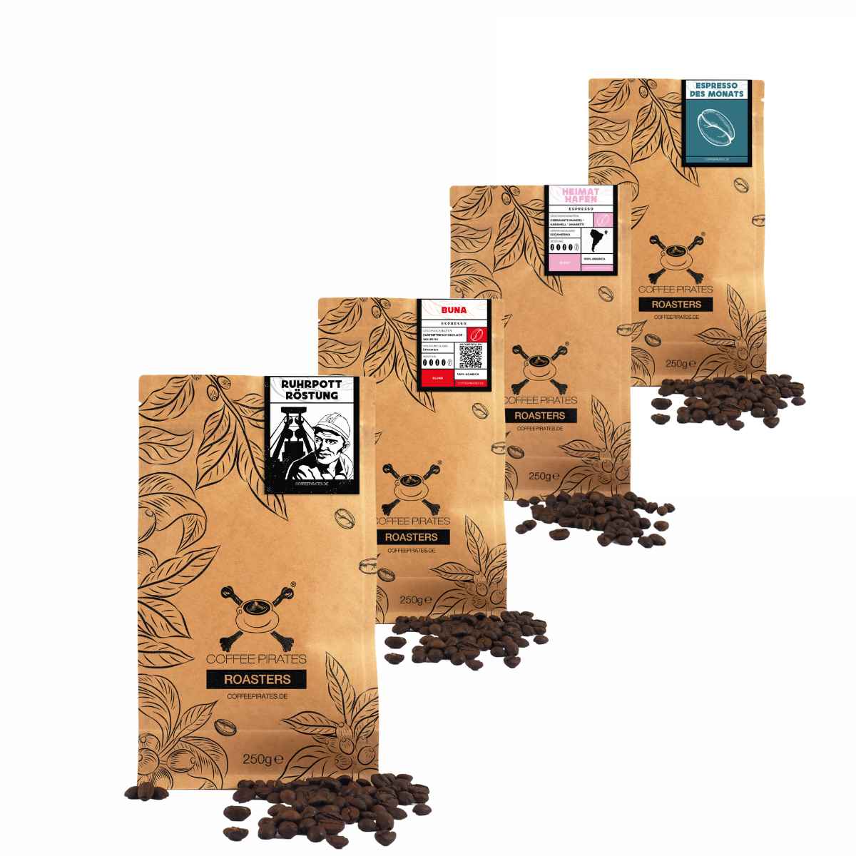 Vier unserer beliebtesten Coffee Pirates Espresso-Röstungen.